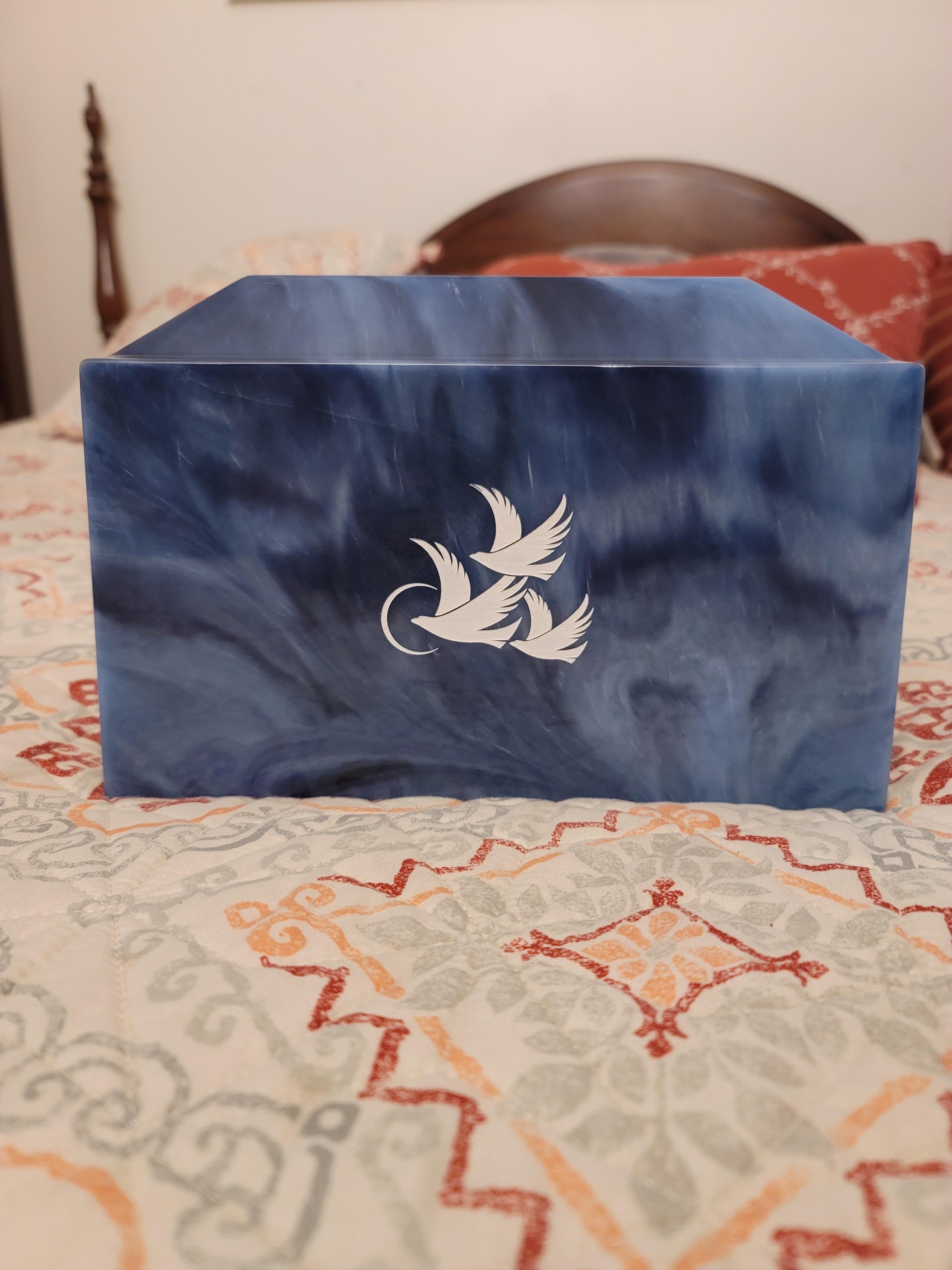 The Trajan Cultured Marble Urn in Blue is a popular memorial urn with its peaceful blue color. This urn offers flexibility as you can keep it at home, put it in a niche, or bury it according to the family's wishes. The brilliant coloring of the urn is medium blue with navy and lighter blue marbling. Blue can be a meaningful choice as it symbolizes tranquility as well as being associated with the sky and water.